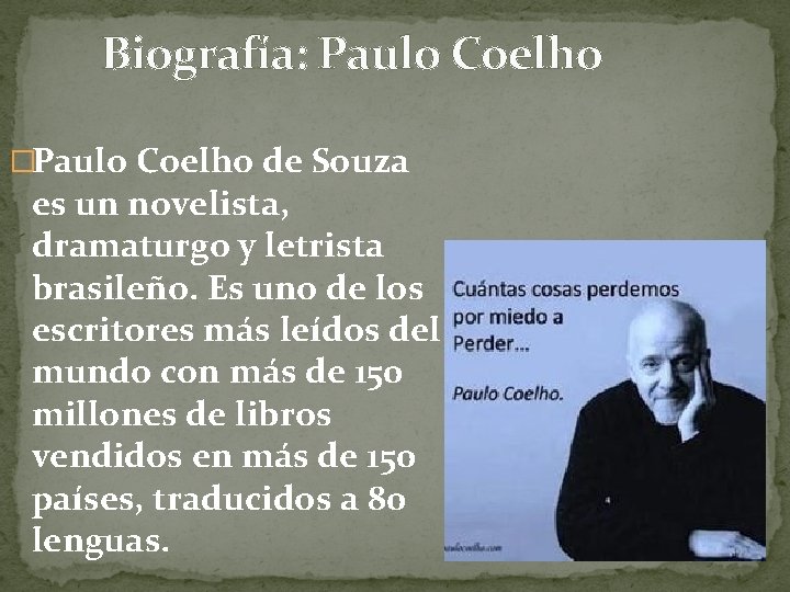 Biografía: Paulo Coelho �Paulo Coelho de Souza es un novelista, dramaturgo y letrista brasileño. Es uno de los escritores más leídos del mundo con más de 150 millones de libros vendidos en más de 150 países, traducidos a 80 lenguas.
