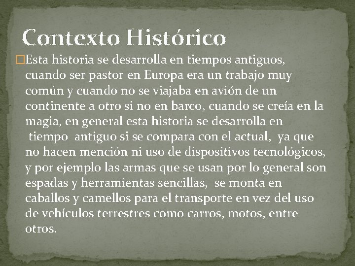Contexto Histórico �Esta historia se desarrolla en tiempos antiguos, cuando ser pastor en Europa era un trabajo muy común y cuando no se viajaba en avión de un continente a otro si no en barco, cuando se creía en la magia, en general esta historia se desarrolla en tiempo antiguo si se compara con el actual, ya que no hacen mención ni uso de dispositivos tecnológicos, y por ejemplo las armas que se usan por lo general son espadas y herramientas sencillas, se monta en caballos y camellos para el transporte en vez del uso de vehículos terrestres como carros, motos, entre otros.