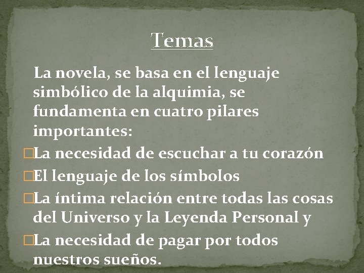 Temas La novela, se basa en el lenguaje simbólico de la alquimia, se fundamenta en cuatro pilares importantes: �La necesidad de escuchar a tu corazón �El lenguaje de los símbolos �La íntima relación entre todas las cosas del Universo y la Leyenda Personal y �La necesidad de pagar por todos nuestros sueños.