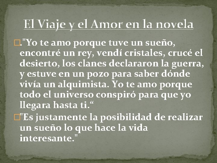 El Viaje y el Amor en la novela �. "Yo te amo porque tuve un sueño, encontré un rey, vendí cristales, crucé el desierto, los clanes declararon la guerra, y estuve en un pozo para saber dónde vivía un alquimista. Yo te amo porque todo el universo conspiró para que yo llegara hasta ti. “ �"Es justamente la posibilidad de realizar un sueño lo que hace la vida interesante. "