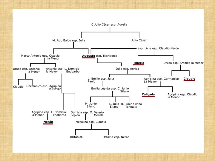 DINASTÍA JULIO-CLAUDIA AUGUSTO (27 a. C. 14 d. C. ) TIBERIO CALÍGULA CLAUDIO NERÓN (14 -37 d- C. ) (37 -41 d. C. ) (41 -54 d. C. ) (55 -68 d. C. )