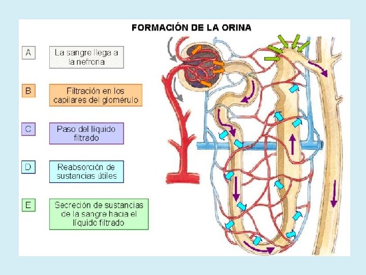 LA NEFRONA La unidad funcional del riñón es la nefrona. Sus funciones básicas son: Ø filtración: algunas sustancias son transferidas desde la sangre hasta las nefronas. Ø secreción: cuando el líquido filtrado se mueve a través de la nefrona, gana materiales adicionales (desechos y sustancias en exceso). Ø reabsorción: algunas sustancias útiles son devueltas a la sangre para su reutilización. Como consecuencia de estas actividades se forma la orina.