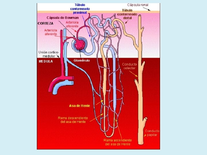 TUBULO RENAL: SE EXTIENDE DESDE LA CÁPSULA DE BOWMAN HASTA UNIRSE CON EL TUBULO COLECTOR. EL TUBULO RENAL TIENE 55 CMS. DE LONGITUD Y ESTA REVESTIDO POR UNA CAPA SENCILLA DE CÉLULAS EPITELIALES. LA FUNCIÓN PRIMORDIAL DEL TUBULO RENAL ES LA REABSORCIÓN DE AGUA, IONES ORGÁNICOS Y OTRAS MOLÉCULAS PROCEDENTES DEL FILTRADO.