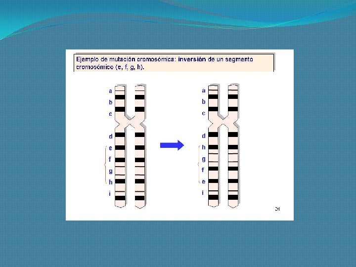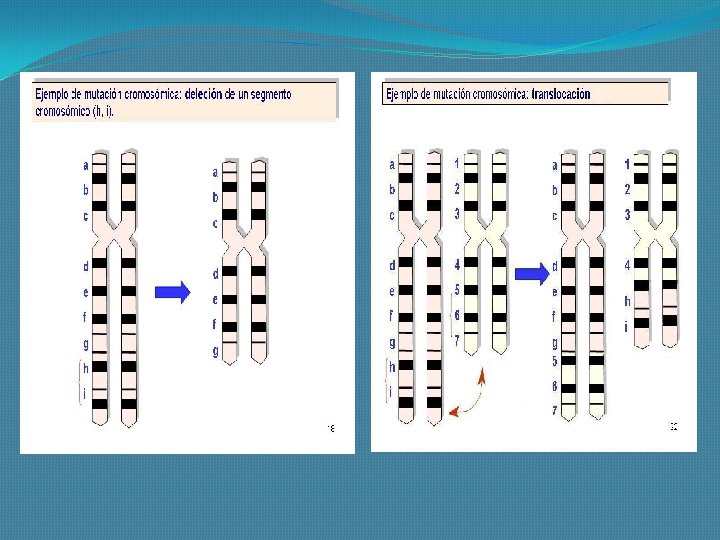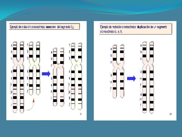Mutaciones Cromosómicas Estructurales �Son las mutaciones que afectan la secuencia de los hipotéticos fragmentos en que se puede subdividir, transversalmente, un cromosoma. Dentro de estas mutaciones podemos mencionar las siguientes: Delección, Inserción, Duplicación, Inversión y Traslocación.