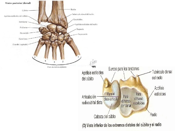 3 - Hueso Grande: Es el de mayor tamaño del carpo. Se articula distalmente con el 3 er metacarpiano y con el hueso trapezoide, el escafoide, el semilunar y el ganchoso. 4 - Hueso Ganchoso: Se articula con el 4 ° y 5 ° metacarpiano, hueso grande y piramidal. Tiene una apófisis llamada gancho que se extiende anteriormente. De la fila proximal el H. escafoides y el semilunar se articulan proximalmente con el radio. La fila distal de los huesos del carpo se articula con la fila proximal de los metacarpianos
