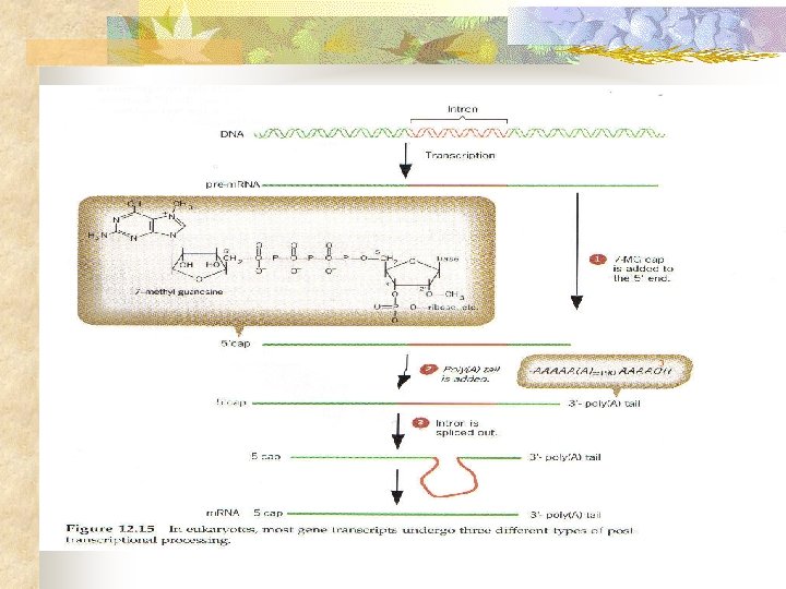 m. RNA en eucariotas: n n Hay un precursor de m. RNA que se conoce como pre-m. RNA Consiste de intrones (no codifican) y exones (codifican) Los intrones se eliminan pero son necesarios, ya que protegen contra mutaciones a la molécula de m. RNA. Luego adquiere el 7 -metil-guanosina y el Poly A.