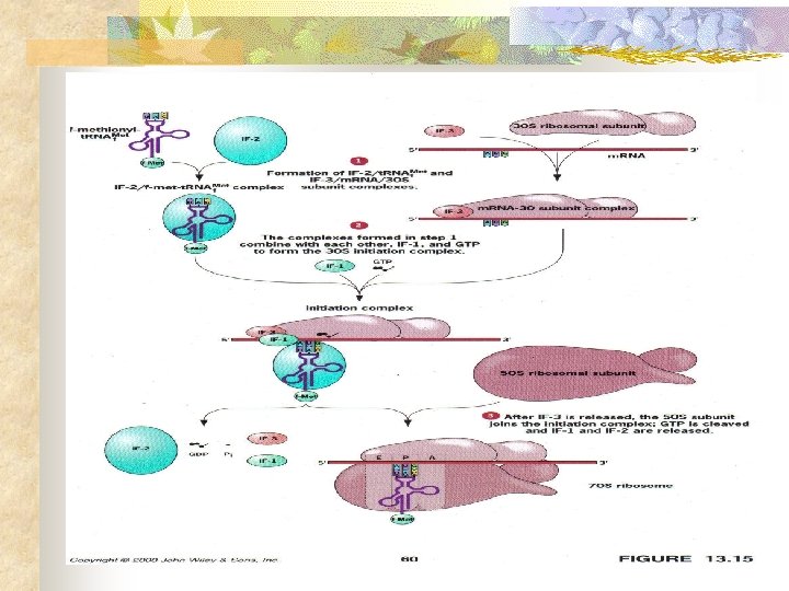 Traducción: (iniciación) n n Envuelve la unión entre el t. RNA con el primer codón del m. RNA El primer codón es AUG (metionina) El t. RNA trae UAC, forma el enlace péptido y trae el A. A. El primer t. RNA que llega se coloca en el lugar P (peptidil) del ribosoma