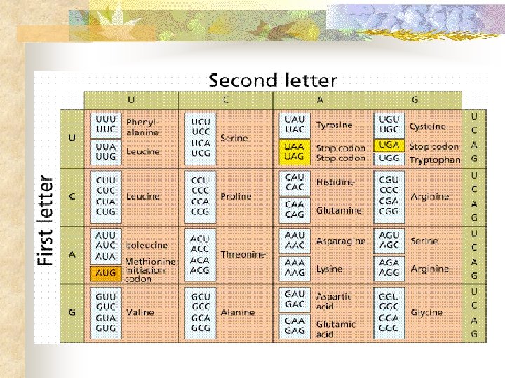 Propiedades del código genético n n n Universal – el mismo código se cumple para todos los seres vivos Señal iniciadora – AUG Señal de terminación – UAA, UAG, UGA
