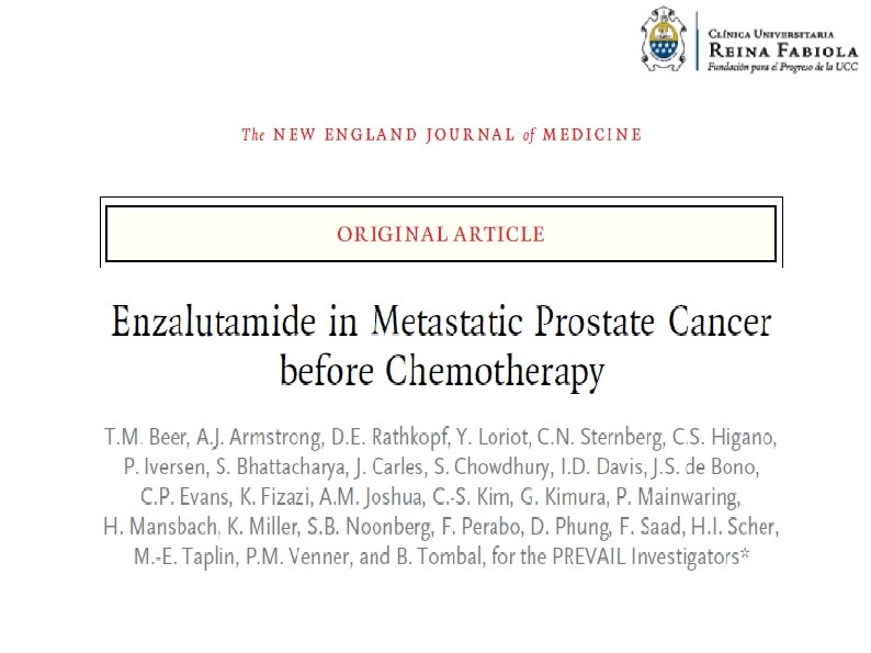 Resultados Un total de 1. 717 pacientes fueron incluidos en el estudio: -872 en el grupo enzalutamide -845 en el grupo de placebo Las características de la enfermedad y y las características demográficas basales fueron bien equilibradas La mediana de tiempo que los pacientes recibieron un fármaco de estudio fue mayor en el grupo enzalutamide que en el placebo (16, 6 meses vs. 4. 6 meses).