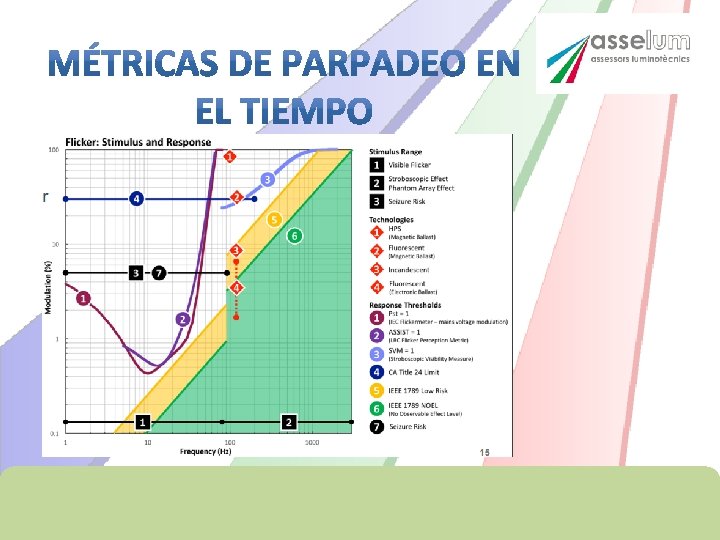 Según CIE (Comisión Internacional de Iluminación) Un Artefacto de Luz Temporal (TLA): Se define como un cambio no deseado en la percepción visual inducido por un estímulo de luz (Modulación de luz temporal, TLM) cuya luminancia o distribución espectral fluctúa con el tiempo. • • Flicker: percepción de inestabilidad visual. . . para un observador estático en un entorno estático. Parpadeo visible a frecuencia de 3 a 80 Hz Efecto estroboscópico: cambio de percepción del movimiento. . . para un observador estático en un entorno no estático; 80 Hz a 2000 Hz