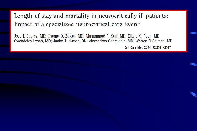 MANEJO NEUROINTENSIVO Razones de Mejores Resultados • • Training Visión Binocular Volumen de pacientes Uso de protocolos (checklists) LOS ↑ Monitoreo Multimodal Ausencia de nihilismo ?