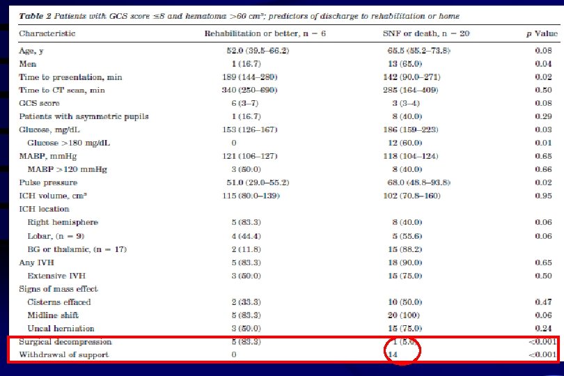 NEUROLOGY 2001; 56: 766– 772 Conclusions: The most important prognostic variable in determining outcome after ICH is the level of medical support provided. Withdrawal of support in patients felt likely to have a “poor outcome” biases predictive models and leads to self-fulfilling prophecies. Our data show that individual patients in traditionally “poor outcome” categories can have a reasonable neurologic outcome when treated aggressively.