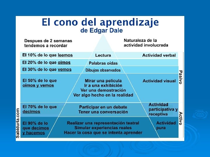 El cono del aprendizaje de Edgar Dale Ø Esta investigación indica que sólo se recuerda el 10% de lo que se lee, lo que coloca a lectura a la cabeza de la pirámide de las actividades menos eficaces para el aprendizaje. En cierto modo, seamos conscientes o no, siempre lo hemos sabido: si fuera tan eficaz leer no habría suspensos. Oír, se coloca con el 20%, ligeramente por delante de ver, quedaría con el 30%. Si combinamos los dos sentidos como hace una demostración o un vídeo, el resultado de lo recordado sería del 50%. Sin embargo, queda lejos de 70% de participar en un debate o conversación, y no digamos del 90% de realizar o simular lo que se intenta aprender.