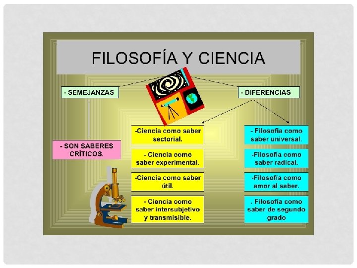 FILOSOFÍA = SABER CRÍTICO CUESTIONA LAS HIPÓTESIS QUE LA CIENCIA ACEPTA SIN CUESTIONAR Va más allá de la ciencia en PROFUNDIDAD Va más allá de la ciencia en EXTENSIÓN CRITICA LOS PROPIOS SUPUESTOS RACIONALES