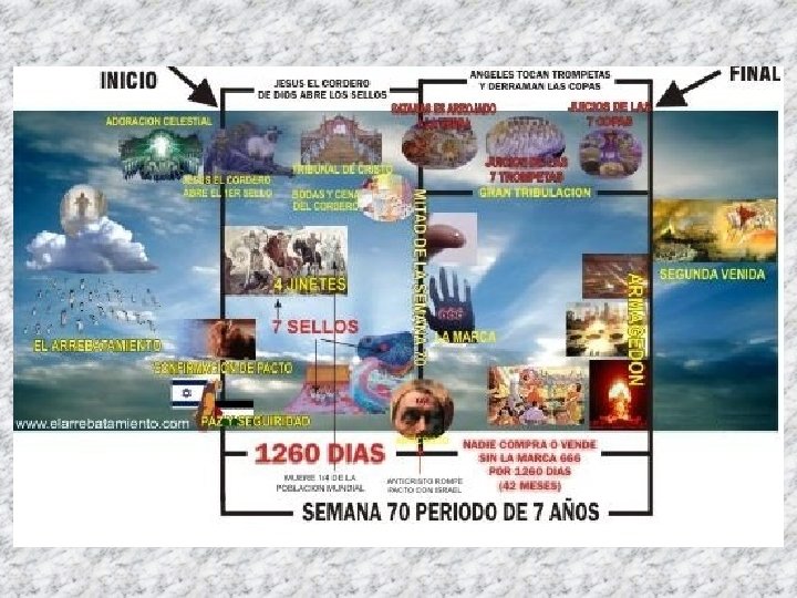 LA TRIBULACIÓN – 7 AÑOS SEMANA 70 PROFECÍA DE DANIEL 9 1º SELLO Cuatro jinetes al 5º SELLO 6° SELLO 7º SELLO Abominación Desoladora Apocalipsis 6: 2 – 11 Ministerio de los 144. 000 israelitas sellados Angustia de Jacob Jeremías 30: 7 3, 5 años Armagedón Apoc. 19 Joel 3: 12