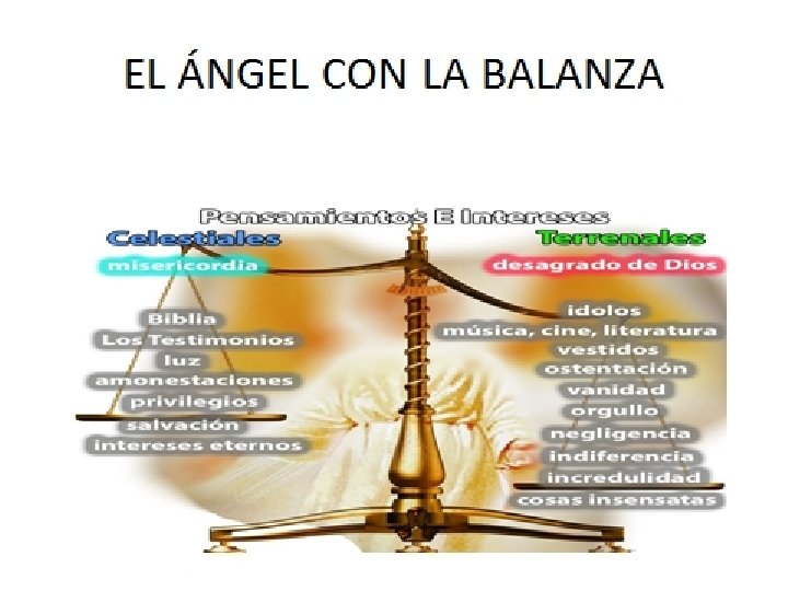 El ángel con la balanza Testimonios I pg. 119. 3. “Vi un ángel de pie con una balanza de dos platillos en cada mano, que pesaba los pensamientos y el interés del pueblo de Dios, especialmente el de los Jóvenes. En el platillo de una balanza estaban los pensamientos y los intereses que tendían hacia el cielo; en el platillo de la otra se hallaban los pensamientos y los intereses terrenales; en este platillo se arrojaba toda la lectura de cuentos, los pensamientos dedicados a los vestidos, la ostentación, la vanidad y el orgullo, etc.