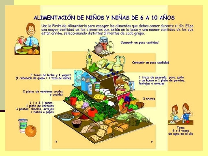 GUIA DE ALIMENTACION PARA EL ESCOLAR Para ajustarse a las altas calorías que gasta en sus actividades diarias necesita cubrir sus requerimientos de: Proteínas minerales ALIMENTACIÓN vitaminas BALANCEADA Necesidades calóricas de las niñas = 1800 calorías/día los niños = 2000 calorías/día Para gastar esta cantidad de calorías, los escolares necesitan realizar al menos una hora de actividad física al día.