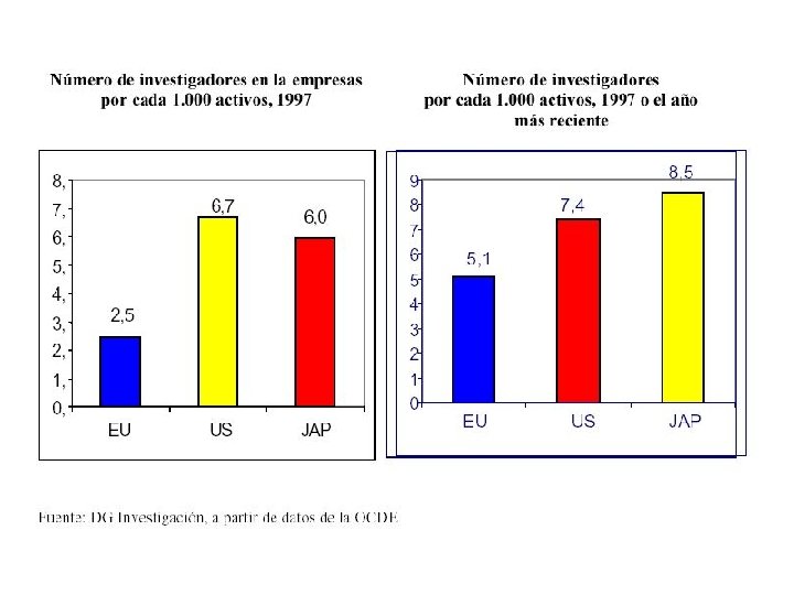 EUROPA versus EEUU • El número de estudiantes europeos en EEUU es más de dos veces superior al de estadounidenses del mismo nivel en Europa • Un 50% de europeos que efectúan un doctorado en EEUU se quedan en largos periodos y a veces definitivamente (Datos obtenidos del informe de la Com. EU. Hacia un Espacio Europeo de Investigación)