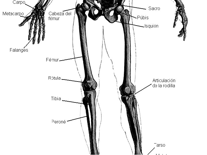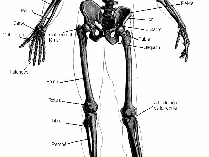 Huesos de la pierna PELVIS Cabeza del fémur Fémur ARTICULACIÓN DE LA RODILLA PIE Tibia Rótula Peroné