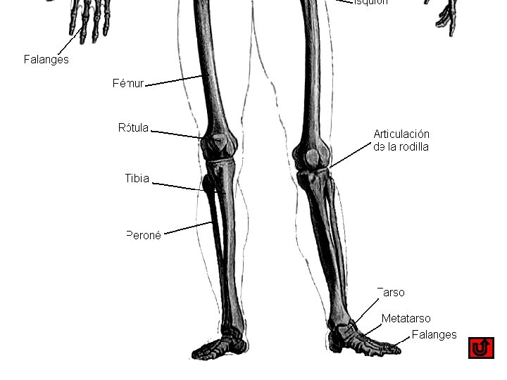UN RECORRIDO POR EL ESQUELETO Al hacer clic con el ratón se irán sucediendo imágenes ampliadas del esquema adjunto. Aparecen nombrados algunos de los principales huesos del cuerpo humano. La última imagen tiene el botón de retorno a la página de inicio.