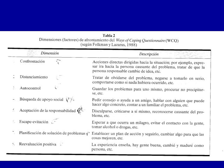 Dimensiones de afrontamiento: • Lazarus: problema - emoción • ENDLER y PARKER: 3 dimensiones básicas: tarea, emocion y evitacion • Roger, Jarvis y Najarian: añaden un cuarto factor: separación afectiva de los sucesos estresantes • Sandin, Chorot: 7 dimensiones que se agrupan en 2: afrontamiento racional focalizado en la emoción. Parecido al de Lazarus • Moos, Cronkite: según el método: activo-cognitivo, activo-conductual y evitación • Según la focalización de las R de afrontamiento: focalizado en la evaluación y focalizado en la emoción