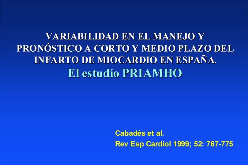 Investigadores del PRIAMHO I Proyecto de Registro de Infarto Agudo de Miocardio HOspitalario F Sogorb, J Catorla, JG Martínez, J Canovas, Hospital General Universitari d'Alacant, ALICANTE; D Pereferrer, A Curós, J Serra, Hospital Germans Trias i Pujol, BADALONA; X Mancisidor, Hospital de Cruces, BARACALDO; M Garcia Moll, JM Dominguez de Rozas, J Guindo, Hospital Sant Pau, BARCELONA; AJ Montón, R Giral, A Santamaría, Hospital "General Yague", BURGOS; E Gonzalez, H Boix, Hospital Gran Via, CASTELLON; A Santana, J Martinez-Bellús, Hospital Can Misses, IBIZA; G Torres, P Rodriguez, J Rodenas, Hospital Virgen de la Arreixaca, EL PALMAR; F Garcia de Burgos, A Meta López, Hospital General de Elche, ELCHE; P Orosa, JM Carmona, T Orengo, Hospital Francesc de Borja, GANDIA; L López-Bescós, C Kallmeyer, L Melgares, Hospital Universitario Getafe, GETAFE; R Masiá, J Sala, X Albert, Hospital Josep Trueta, GERONA; N Alonso Orcajo, R García, J Bayón, Complejo Hospitalario de León, LEON; M de los Reyes, J Alcázar, Instituto de Cardiología, MADRID; J Rodriguez, Hospital 12 de Octubre, MADRID; E Torrado, JA Ferriz, Hospital Regional de Málaga, MALAGA; M Fiol, J Bergadá, Hospital de Son Dureta, PALMA DE MALLORCA; P Pabón, Hospital Universitario de Salamanca, SALAMANCA; V Bertomeu, A Frutos, F Colomina, Hospital Universitario de San Juan, SAN JUAN; F Marrero, M J Garcia, L Martí, Hospital Universitario de Canarias, SANTA CRUZ DE TENERIFE; J M Sanjosé, P Colveé, Hospital Marqués de Valdecilla, SANTANDER; M Jaquet, Hospital Xeral de Galicia Gil Casares, SANTIAGO DE COMPOSTELA; J Rojas, J García-Rovira, J Trujillo, Hospital Universitario Virgen Macarena, SEVILLA; S Quintana, M Ibartz, I Cherta, Hospital Mutua de Terrassa, TERRASSA; J Sanchez, L Martos, Hospital Virgen del Valle, TOLEDO; R Claramonte, L Gabaldà, Hospital de Tortosa Verge de la Cinta, TORTOSA; I Echanove, J V Vilar, R Tellols, Hospital General de Valencia, VALENCIA; A Cabadés, I Ceniceros, R Gastaldo, M Palencia, Hospital La Fe, VALENCIA; M Francés, M Garcia, A Hérvas, L Cortés, F Fajarnés, Hospital Arnau de Vilanova, VALENCIA; JJ Sanz, JL Bratos, P Enriquez, Hospital del Rio Hortega, VALLADOLID; J Bermejo, M del Mar de Latorre, L de la Fuente, I Garcimartin, Hospital Universitario de Valladolid, VALLADOLID; F Arós, A Loma, Hospital Txagorritxu, VITORIA; G Hernando, Hospital de Galdacano, VIZCAYA; J Marrugat, M Pavesi, Institut Municipal d'Investigació Mèdica, BARCELONA