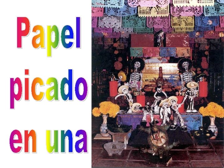 Ø Ofrendas (altares) Ø Visitas al panteón (cementerio), música Ø Ceremonias religiosas Ø Pan de muerto y comidas típicas Ø Calaveras de azúcar y juguetes de madera y de papier maché Ø Papel picado Ø “Calaveras”: dibujos y también poemas publicados en los periódicos (no se incluyen aquí).