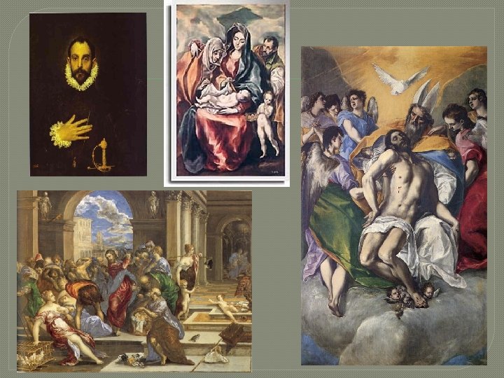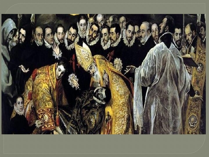 El Expolio 1577 -79 “The Plundering / The Disrobing of Christ” � � � � Está en La Catedral de Toledo, La Seo, encima del altar. Punto Focal – el rojo del vestido de Cristo Depto – una multitud de soldados romanos, sin espacio. Dedos, cuerpos elongados. Hay colores vivos Hay 3 Marias –es controversial, la iglesia solo reconocía dos Marías, pero El Greco no la cambió. La iglesia no le pagó a El Greco por sus 2 años de trabajo!