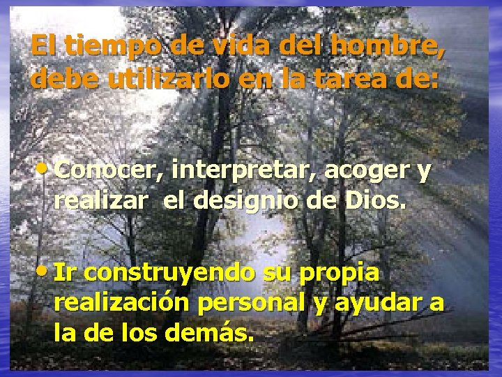 El tiempo de vida del hombre, debe utilizarlo en la tarea de: • Conocer, interpretar, acoger y realizar el designio de Dios. • Ir construyendo su propia realización personal y ayudar a la de los demás.