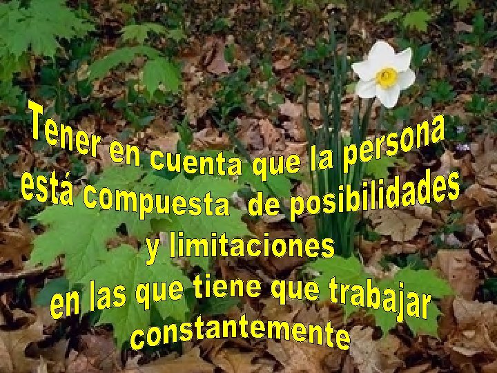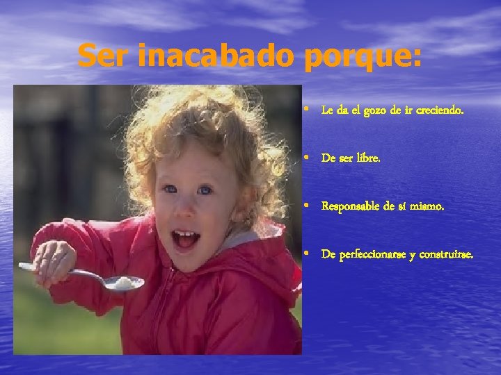 Ser inacabado porque: • Le da el gozo de ir creciendo. • De ser libre. • Responsable de sí mismo. • De perfeccionarse y construirse.