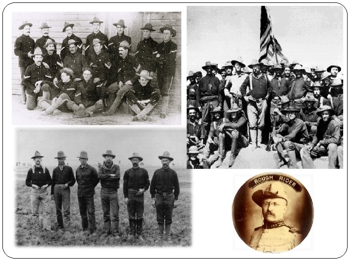 Los “Rough Riders” Grupo de antiguos vaqueros y estudiantes universitarios que formaron el 1º regimiento de voluntarios de caballería, caballería comandados por Theodore Roosevelt en la lucha por Cuba. Junto con los soldados afroamericanos del 9º y 10º regimiento de caballería, lucharon en la Batalla de la Colina de San Juan.