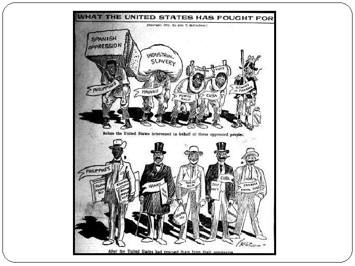 Cuba - Protectorado de Estados Unidos, (país técnicamente independiente pero controlado realmente por otro). Puerto Rico y Guam territorios americanos. Filipinas- Vendido por España a Estados Unidos por $20 millones de dólares. Tratado de París 10 de diciembre de 1898