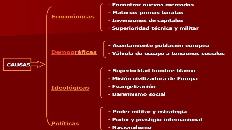 Justificaciones Si Francia quiere seguir siendo un gran país, es preciso que lleve su lengua, sus costumbres, su bandera, sus armas y su genio a todos lugares donde sea posible. Ferry, J. 1885 En primer lugar, creo en el Imperio Británico y, en segundo, creo en la raza británica. Yo creo que la raza británica es la más grande de las razas imperiales que el mundo haya conocido (…) Yo digo esto como una evidencia de los éxitos que hemos conseguido administrando las vastas posesiones ligadas a estas pequeñas islas. Discurso de Chamberlain. Londres. (11 -XI-1895)