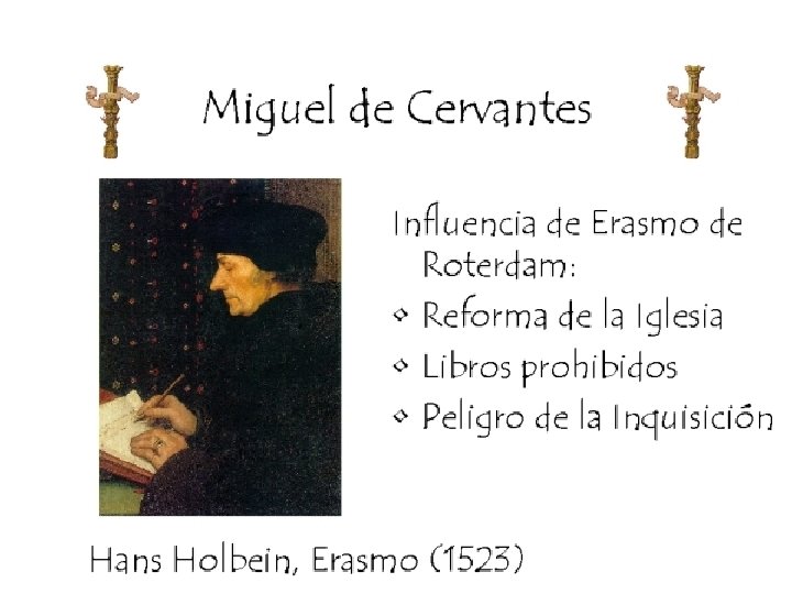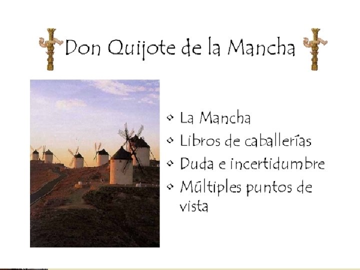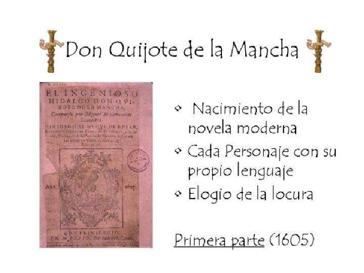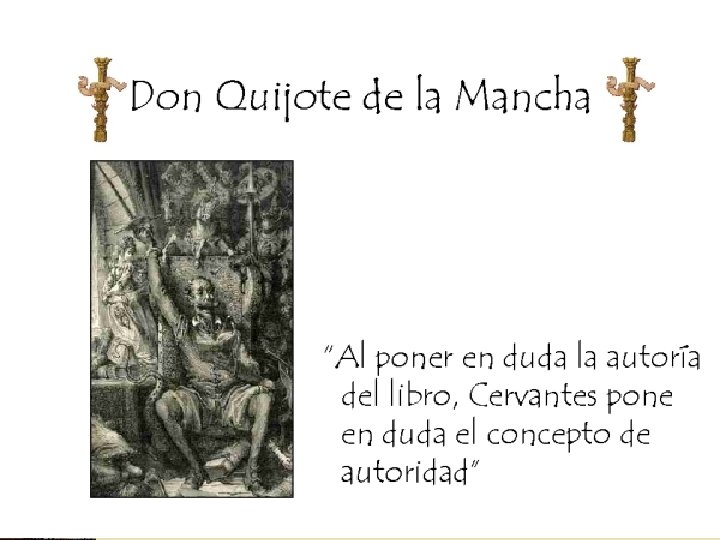 Fondo histórico wla caballería- hubo distintas imágenes. w. La versión bastarda estaba en las novelas de caballería. w. Cervantes tuvo que decifrar lo falso de la verdadero. w. El Quijote es de dos caras: serio y burlado