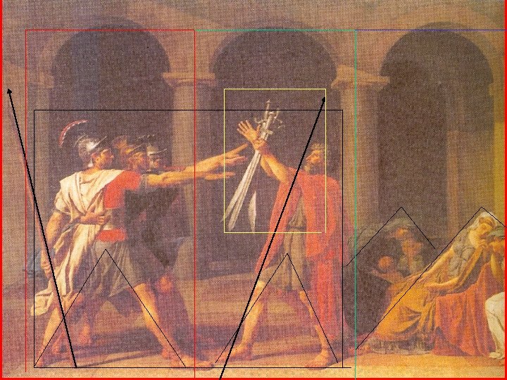 • Forma i composició: – Forma: Dibuixística – Composició: • Tancada • Simetria: espases, pare, arc central; homes/rectes/dinàmica; dones/ondulació/estàtica). Importància del nombre 3. • Geometria: Les figures s’inscriuen en un rectangle. Superficialitat. Formen un fris. Figures disposades en tres grups amb predomini dels triàngles. • Línies compositives: Diagonals rítmiques que formen les composicions triangulars.