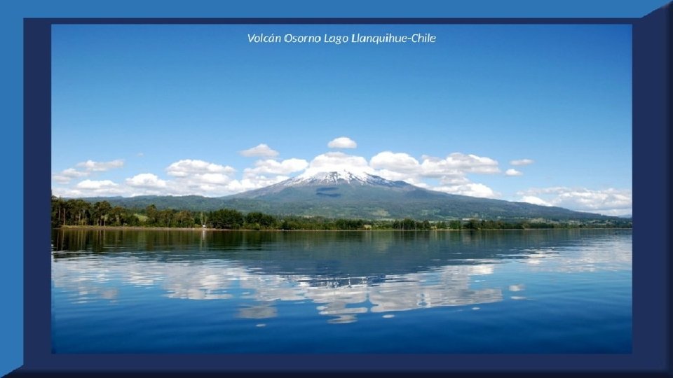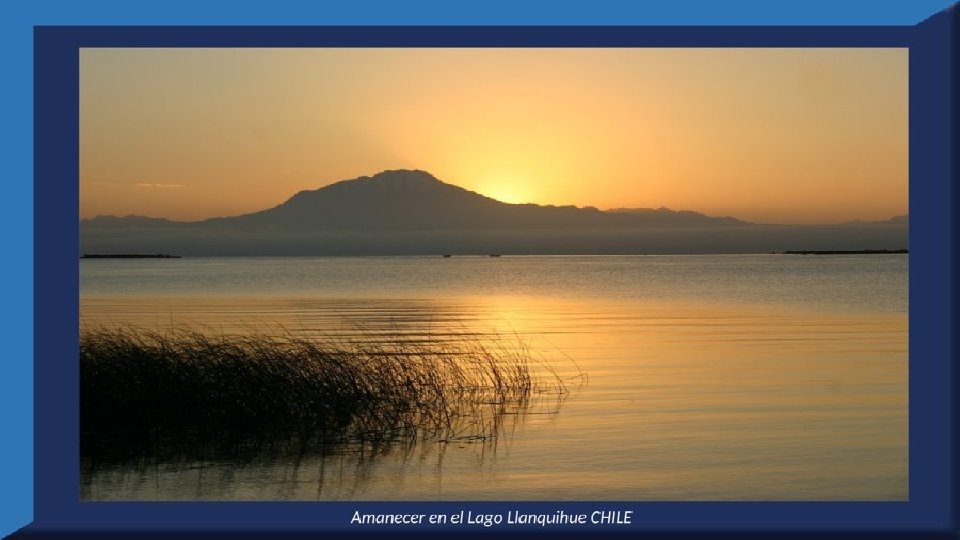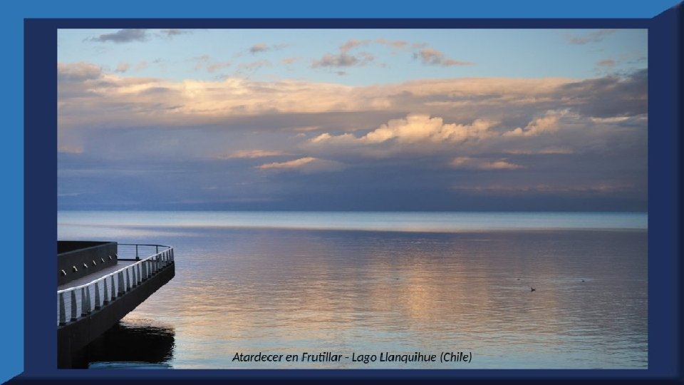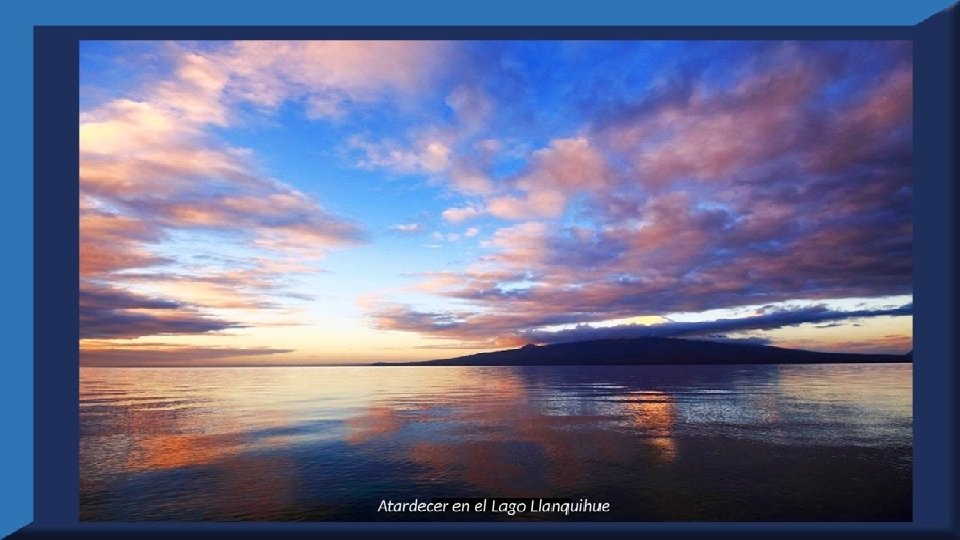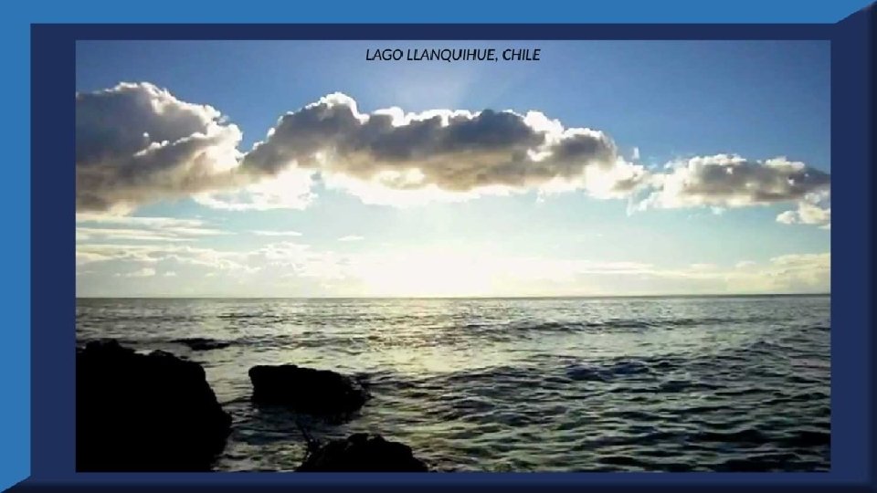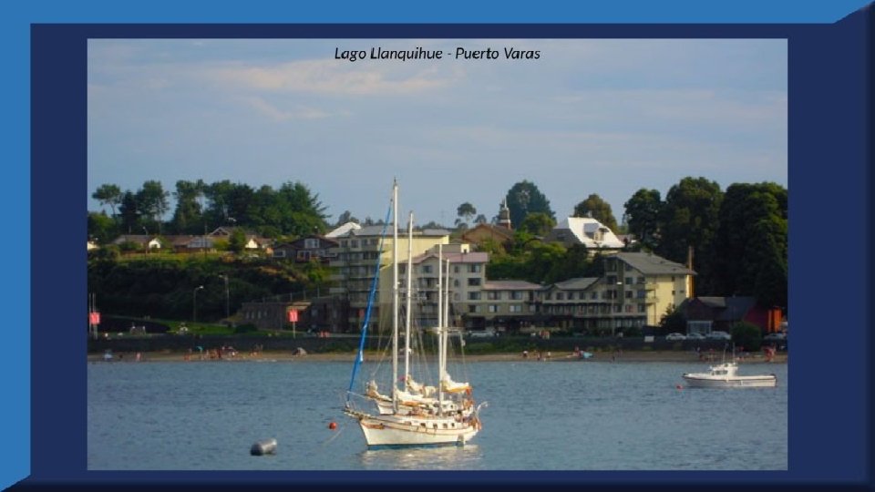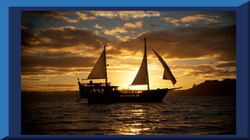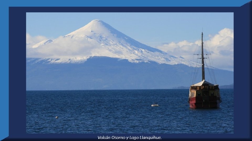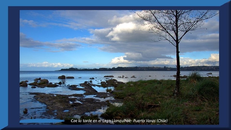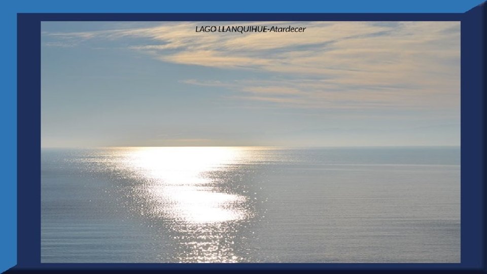 El lago Llanquihue, es el mayor de los lagos de Chile y está situado en el departamento á que da su nombre. Su mayor extensión es de este a oeste. entre el puerto del Volcán y el de Philippi, que mide 43 km; siendo la de Norte á Sur. , entre el puerto de Octay y Puerto Varas, de 41 km. Baña por el oriente la base del volcán de Osorno al cual se ve resaltar majestuosamente en toda su altura desde casi todos los puntos de su superficie. Se rodea de costas desiguales por senos de moderada internación que forman puertos y caletas para embarcaciones menores, como los ya mencionados y los del Frutillar, de Domeyko, de Pérez Rosales, de Cox, de Fonck. Sus márgenes, de suaves colinas en general, se visten de abundante vegetación y arbolado, y ofrecen tierras labraderas y fértiles que ostentan algún cultivo. Sus aguas son puras y dulces, y de un hermoso azul marino, debido á la notable hondura de su fondo; suministrándoselas en cuantiosa copia las frecuentes lluvias y los arroyos de las alturas circunvecinas que caen en él, algunos en vistosas cascadas. Desagua por su lado sudoeste á 9 km al NO. de Puerto Varas dando origen al río Maullín. Uno de los destinos turísticos privilegiados de Chile son las ciudades de Frutillar y Puerto Varas, ubicadas cerca de Puerto Montt. También existen otros pueblitos como Puerto Octay, Llanquihue, Las Cascadas y Ensenada, todos estos lugares tienen en común una cosa: el maravilloso lago Llanquihue (salvo Puerto Montt, claro). Creó: Jeremías Para: mis pps Música: Anhelos-Alfredo Gutiérrez