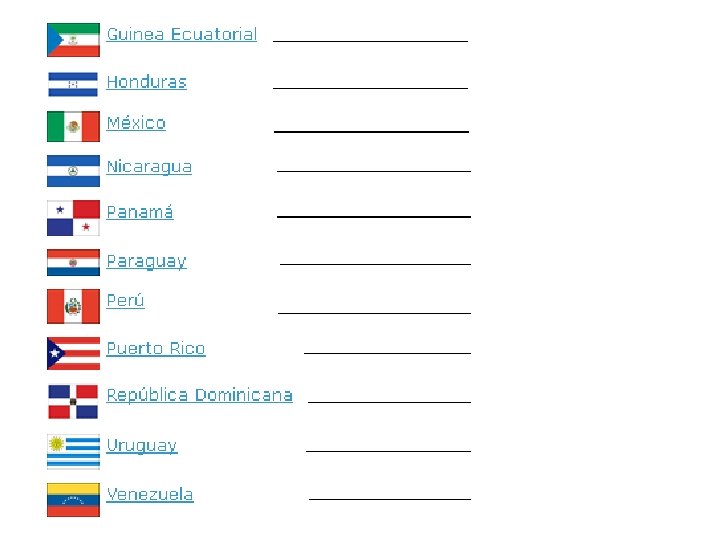 LAS CAPITALES Country 1. Mexico 2. Guatemala 3. El Salvador 4. Honduras 5. Nicaragua 6. Costa Rica 7. Panama 8. Cuba 9. Dominican Republic Capital Mexico City Guatemala City San Salvador Tegucigalpa Managua San José Panama City Havana Santo Domingo 10. Puerto Rico 11. Venezuela 12. Colombia 13. Ecuador 14. Peru 15. Bolivia 16. Chile 17. Argentina 18. Paraguay 19. Uruguay 20. Spain 21. Equatorial Guinea San Juan Caracas Bogotá Quito Lima La Paz / Sucre Santiago Buenos Aires Asunción Montevideo Madrid Malabo