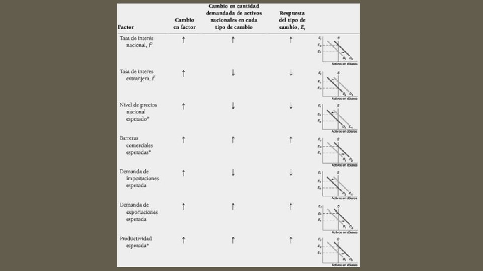 Ø Niveles de precios relativos. A largo plazo, un aumento en el nivel de precios de un país (en relación con el nivel de precios extranjero) hace que su moneda se deprecie, y una caída en el nivel de precios relativo del país hace que su moneda se aprecie. Ø Barreras Comerciales. Las barreras al libre comercio como los aranceles (impuestos sobre bienes importados) y las cuotas (restricciones sobre la cantidad de bienes extranjeros que pueden importarse) podrían afectar el tipo de cambio. Ø Preferencias por los bienes nacionales frente a los extranjeros. El aumento en la demanda por las exportación es de un país hace que su moneda se aprecie a largo plazo; por el contrario, la creciente demanda de importaciones hace que la moneda nacional se deprecie. Ø Productividad. Cuando la productividad en un país se eleva, tiende a aumentar en sectores nacionales que producen bienes comerciables en lugar de bienes no comerciables. • La mayor productividad se asocia con un declive en el precio de los bienes comerciables de producción nacional, en relación con los bienes comerciables extranjeros. • Como resultado, aumenta la demanda de bienes comerciables locales, y la moneda local tiende a apreciarse. • Sin embargo, si la productividad de un país es menor que la de otros países, sus bienes comerciables se vuelven relativamente más costosos, y la moneda tiende a depreciarse