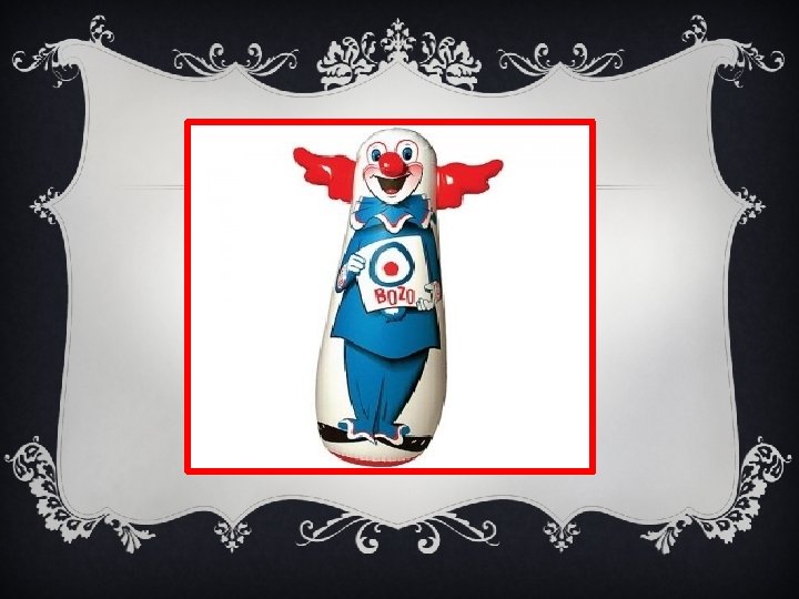 EL MUÑECO BOBO • Dar credibilidad a su creencia de que toda conducta humana es aprendida a través de la imitación social y las repeticiones, en lugar de heredarse a través de factores genéticos. • Mostrar, mediante el uso de agentes agresivos y no agresivos, que un niño tendería a imitar y aprender del comportamiento de un adulto.