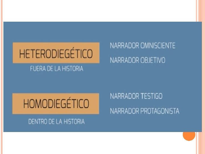 CARACTERÍSTICAS DE LOS NARRADORES Narrador heterodiegético Narrador homodiegético 1. El narrador homodiegético es un personaje que se sitúa dentro de la historia relatada. 2. Para narrar usa la primera persona singular. (yo-nosotros) 1. Este tipo de narrador se encuentra fuera del relato, es decir, no es un personaje que participe en los acontecimientos narrados. 2. Éste narra los acontecimientos en tercera persona. (él-ellos)