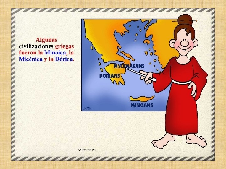 El origen de la civilización griega se remonta a la Prehistoria. Su nombre era Hélade por eso sus habitantes eran llamados Helenos. Fue una floreciente cultura que tuvo su origen unos 3. 000 años a. C. y llegó a su pleno apogeo en la ciudadestado de Atenas, durante el siglo V a. C. Grecia ocupa una parte del Sureste europeo que se conoce como Península Balcánica. El territorio de la Grecia Antigua, comprendía tres partes: -Grecia continental. -Grecia insular con las islas del mar Egeo, entre otras Creta, Rodas, Lesbos. -Grecia asiática: la costa mediterránea de la actual Turquía.