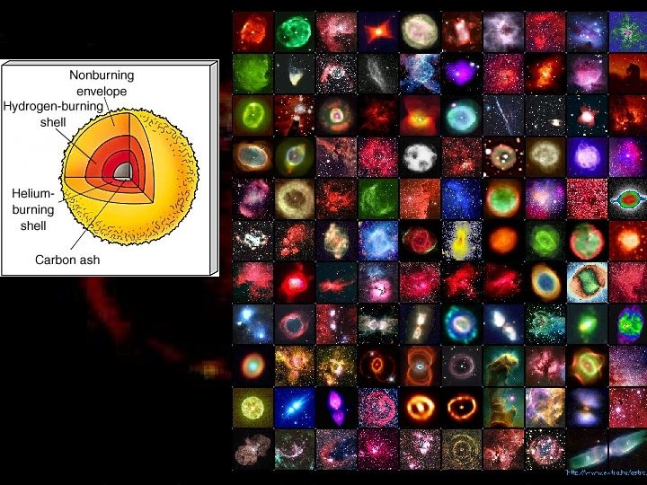 Formación de elementos más pesados En el borde exterior de la capa de cenizas de Carbono y el interior de la capa de quema de Helio, se pueden dar reacciones de formación de átomos mas pesados como: 12 C + 4 He 16 O + 4 He 20 Ne + 4 He + 20 Ne + 24 Mg + 16 O