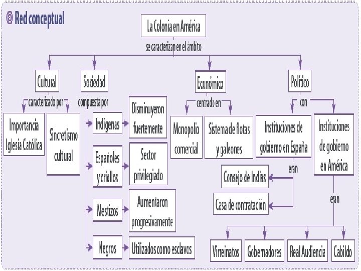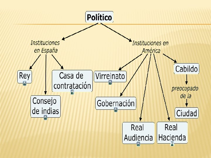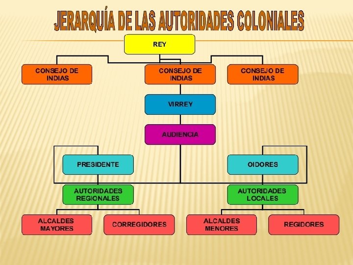 INSTITUCIONES EN ESPAÑA • Rey: Máxima autoridad. • La Casa de contratación: Era el organismo encargado del comercio y flujo de pasajeros entre España y América. • El consejo de Indias: Organismo que aconsejaba al rey en América, proponía leyes y candidatos para el nuevo mundo, era el máximo tribunal.