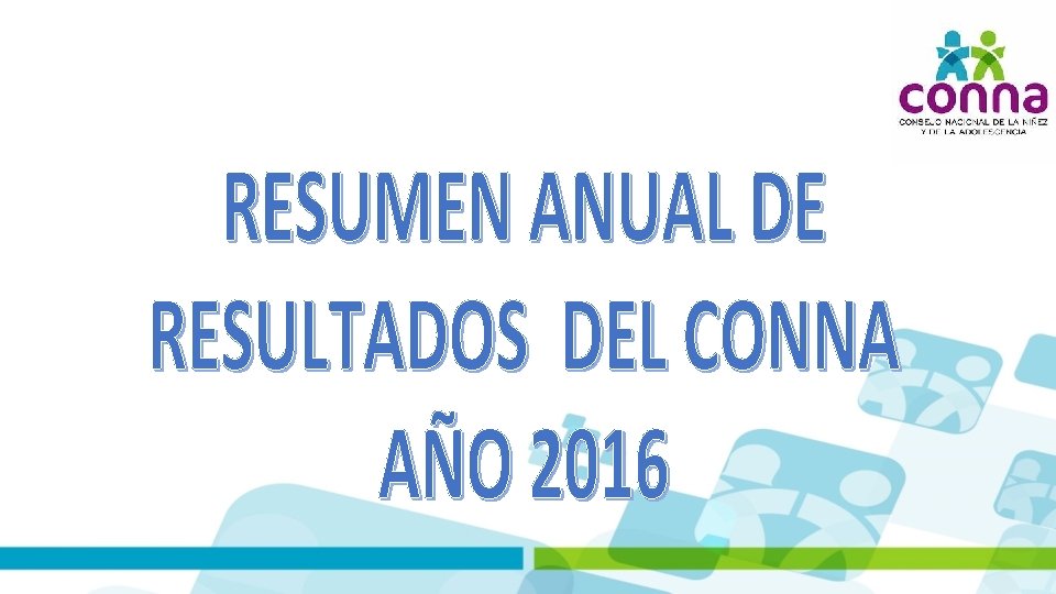 DESAFIOS DEL CONNA PARA EL 2017 ü Promover la adecuación de los programas nacionales y de las entidades de atención, a la Doctrina de Protección Integral de la Niñez y la Adolescencia. ü Incidir en la adecuación de la normativa nacional a los estándares y parámetros internacionales de protección a Derechos Humanos de niñez y adolescencia. ü Desarrollar y fortalecer al CONNA en sus funciones de ente rector de la PNPNA , Coordinador del Sistema y en la Defensa Efectiva de los derechos de las niñas, niños y adolescentes.