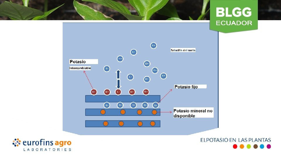 Potasio intercambiable – Una forma disponible del potasio en el suelo, que las plantas pueden extraer fácilmente. Esta fracción de potasio esta absorbida en la superficie de las partículas de arcilla y materia orgánica en el suelo. Se encuentra en equilibrio con la solución del suelo y se desplaza rápidamente cuando las plantas absorben el potasio de la solución del suelo. Potasio en la solución del suelo - El potasio disuelto en la solución del suelo está inmediatamente disponible para las plantas. Sin embargo, las cantidades presentes en la solución del suelo son muy pequeñas. Cuando la planta extrae el potasio de la solución del suelo, su concentración se repone inmediatamente por el potasio en la forma intercambiable.