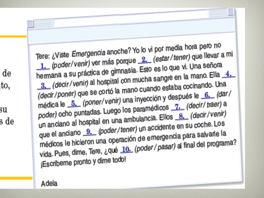 Vamos a practicar Escribe el verbo en el pretérito que mejor completa las oraciones. 1. Ayer tú ______ (traer/decir) que no fuiste a la fiesta. 2. Mis padres ______ (conducir/traducir) el reporte. 3. El huracán ______ (traer/conducir) mucha destrucción. 4. Los bomberos ______ (traer/conducir) el camión de bomberos. 5. Nosotros______ (traer/decir) los muebles a la camioneta. 6. La reportera ____ (conducir/traducir) los artículos del periódico. 7. Los estudiantes no ______ (conducir/traducir) bien el informe. 8. ¿______ (conducir/traducir) tú el coche por diez horas?