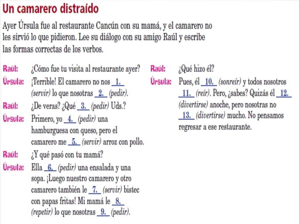Vamos a practicar Escribe el verbo en el pretérito que mejor completa las oraciones. 1. Ayer tú ______ (conseguir) el noticiero. 2. Mis padres ______ (pedir) el reporte. 3. El hurácan ______ (seguir) por varias horas. 4. Los bomberos ______ (despedirse) de la gente. 5. El herido ______ (morir) en el hospital. 6. Nosotros ______ (divertirse) en la asambléa el viernes pasado. 7. Los estudiantes no ______ (mentir) a la maestra. 8. Ella ______ (sentirse) mal la semana pasada. 9. Los camareros ____ (servir) muy bien la comida. 10. _____ (Vestirse) de prisa porque nos despertamos tarde. 11. Yo _______ (seguir) derecho y después doblé a la izquierda. 12. El policía ______ (preferir) investigar el incendio ahora.