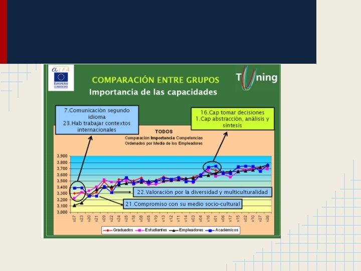 Objetivos clave • • Titulaciones fácilmente comparables y comprensibles “desde dentro”. Movilidad de los poseedores de títulos universitarios y profesionales "El punto de partida del proyecto es la búsqueda de puntos comunes de referencia centrándose en las competencias y destrezas (siempre basadas en el conocimiento)"