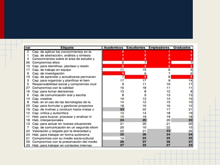 Lista de las competencias genéricas para América Latina 1) Capacidad de abstracción, análisis y síntesis. 2) Capacidad de aplicar los conocimientos en la práctica. 3) Capacidad para organizar y planificar el tiempo. 4) Conocimientos sobre el área de estudio y la profesión. 5) Responsabilidad social y compromiso ciudadano. 6) Capacidad de comunicación oral y escrita. 7) Capacidad de comunicación en un segundo idioma. 8) Habilidades en el uso de las tecnologías de la información y de la comunicación. 9) Capacidad de investigación. 10) Capacidad de aprender y actualizarse permanentemente. 11) Habilidades para buscar, procesar y analizar información procedente de fuentes diversas.