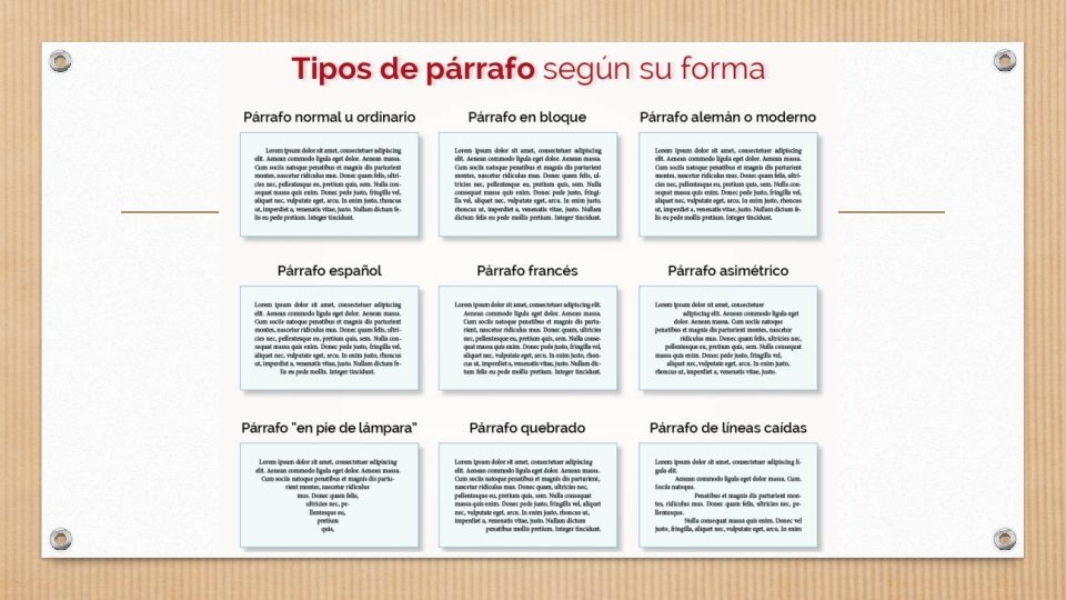 Párrafos de forma. • Los tipos de párrafo, con distintas alineaciones y desde la perspectiva de la composición y la maquetación, son los siguientes: